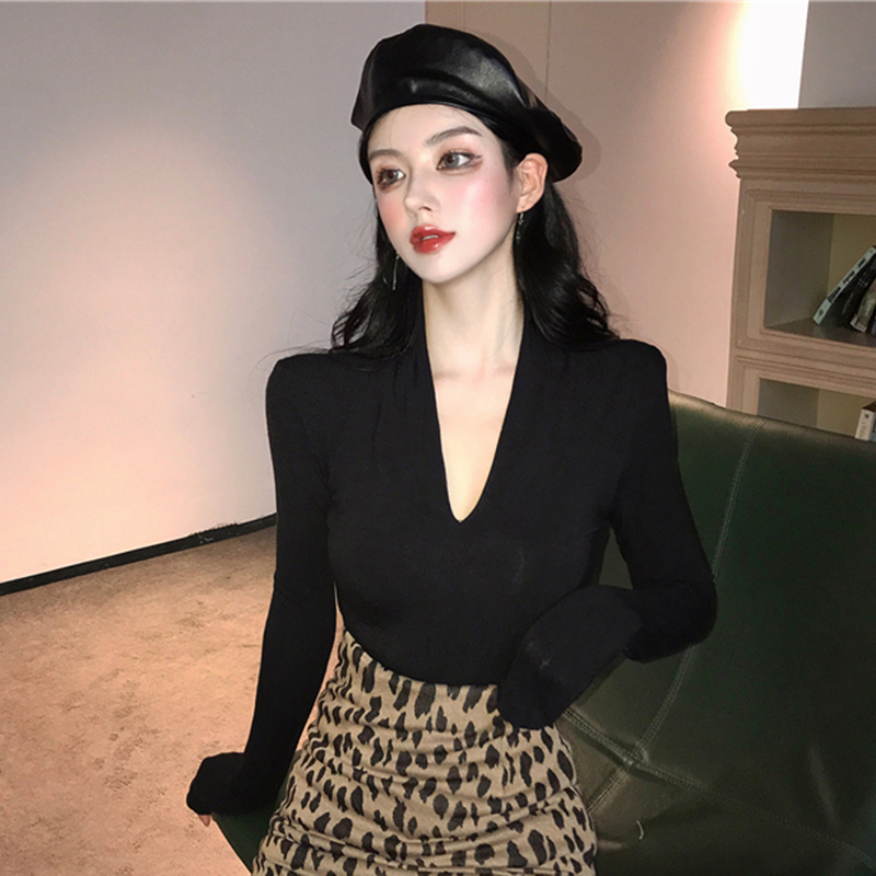 港味chic長袖打底衫女秋冬裝2018新款韓版氣質v領修身顯瘦T恤上衣