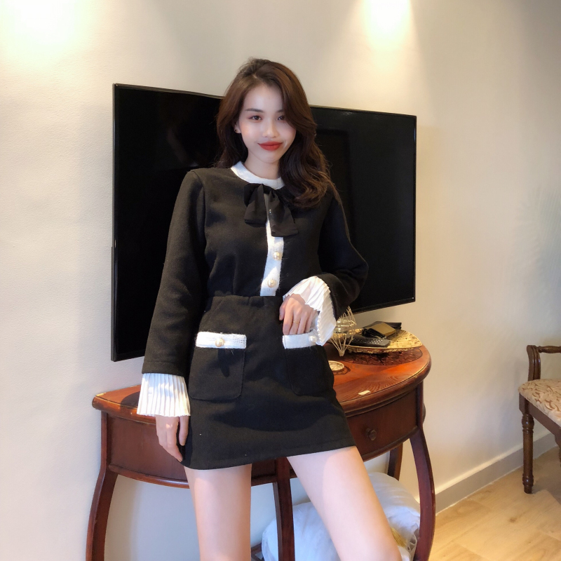 / 韓國秋冬復古名媛小香風喇叭袖拼接毛呢上衣高腰半身裙時尚套裝女
