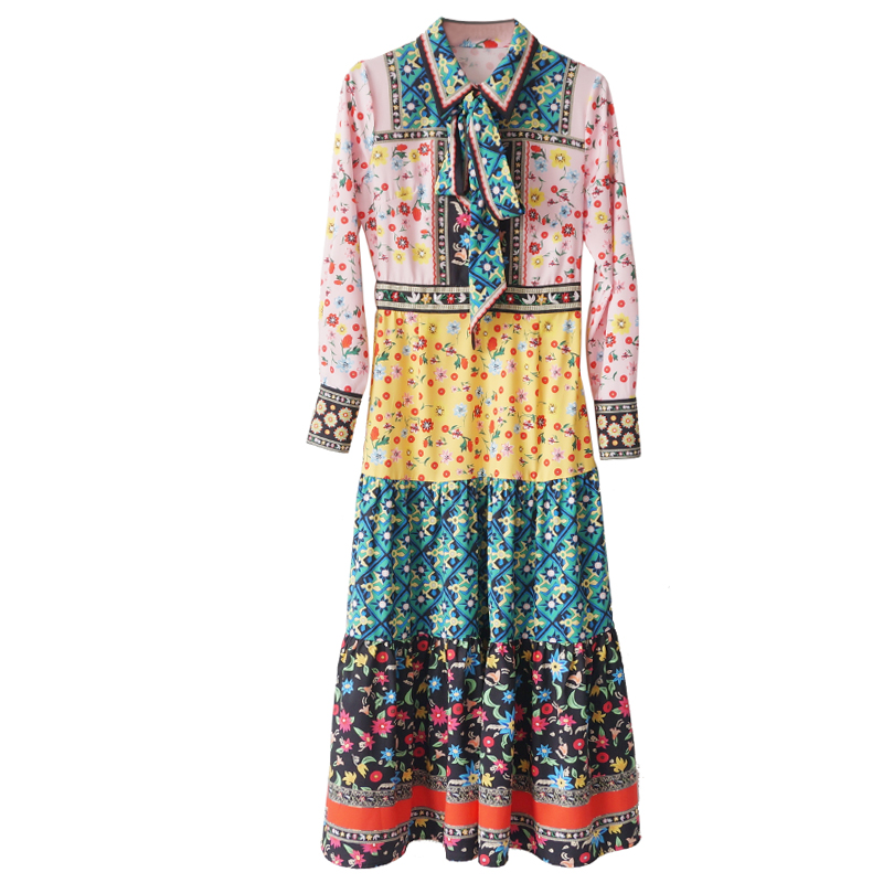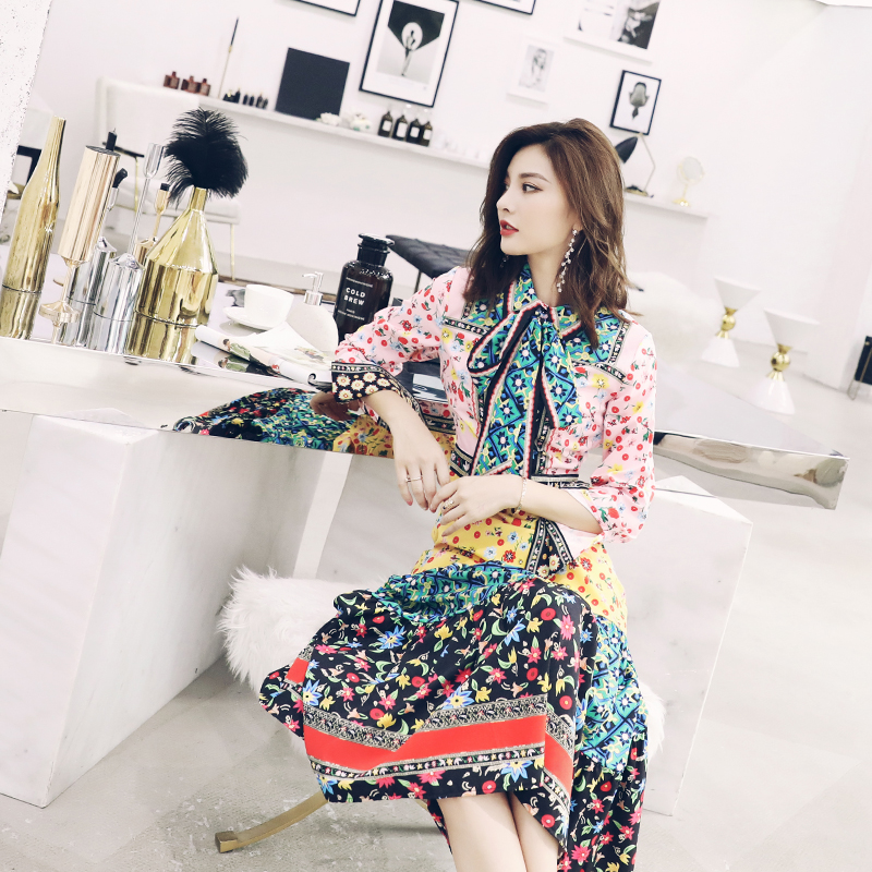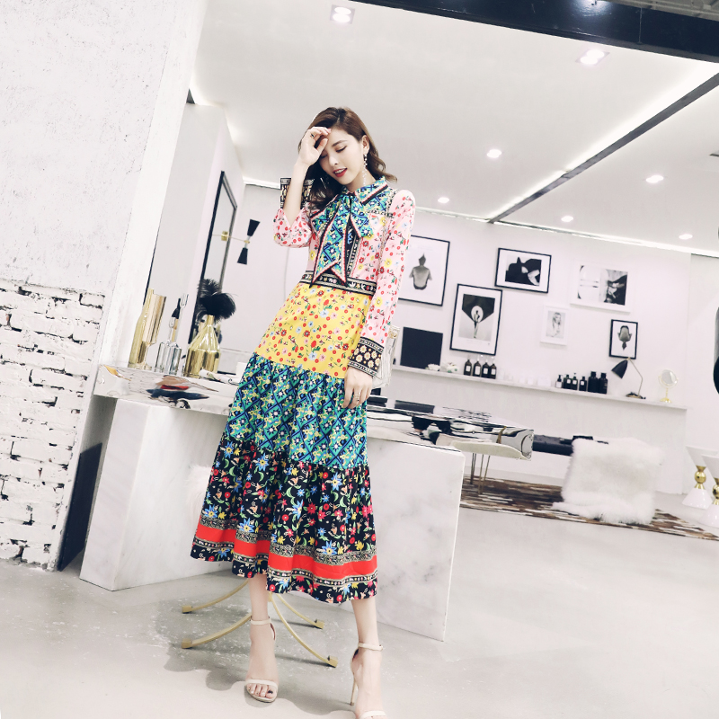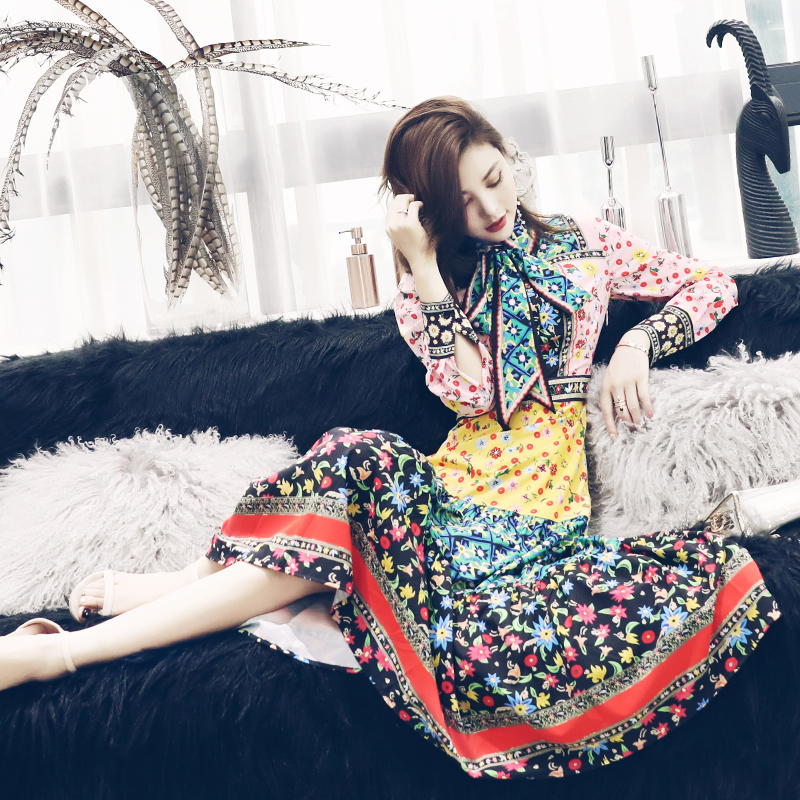 / 印花連衣裙女夏2018新款長袖收腰顯瘦大擺裙時尚氣質修身長裙子潮