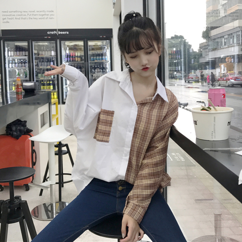 女2018新款秋裝韓版寬松個性拼接格子襯衫學生港風中長上衣外套潮