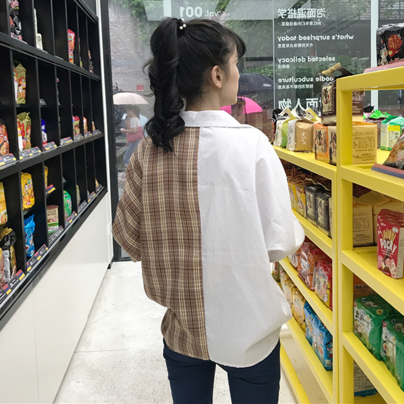 / 女2018新款秋裝韓版寬松個性拼接格子襯衫學生港風中長上衣外套潮