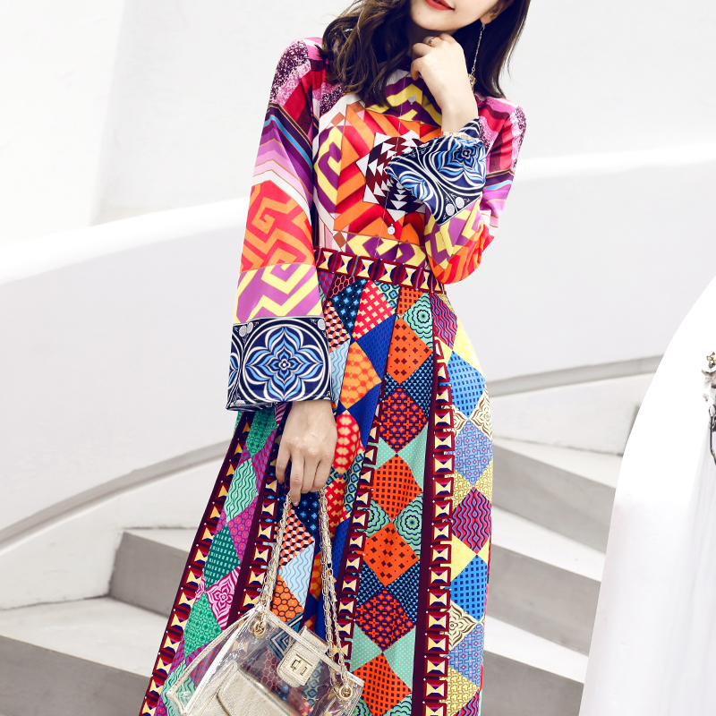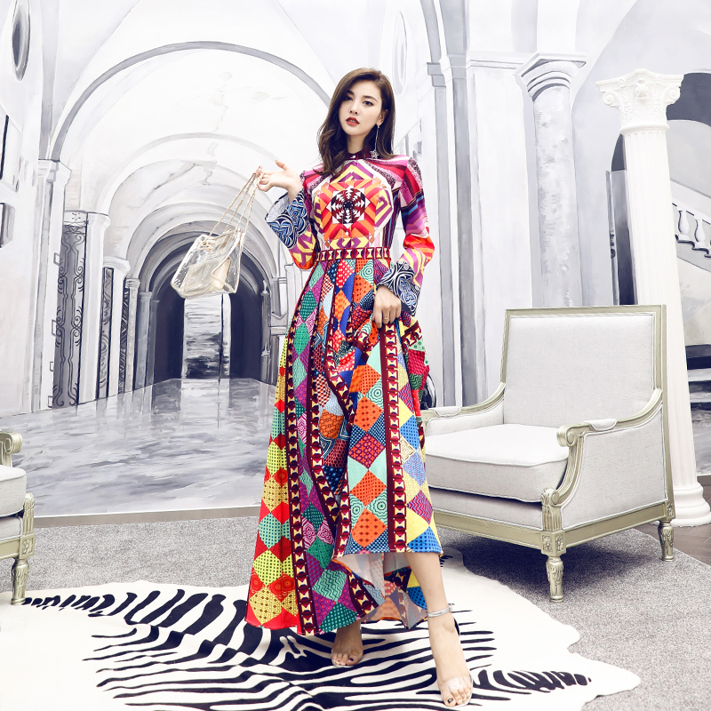 / 連衣裙女2018夏季新款印花大擺顯瘦過膝長裙中長款長袖復古秋裙子